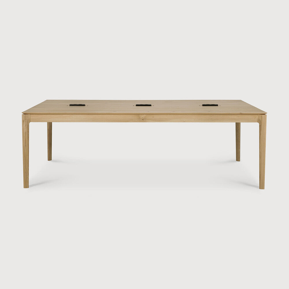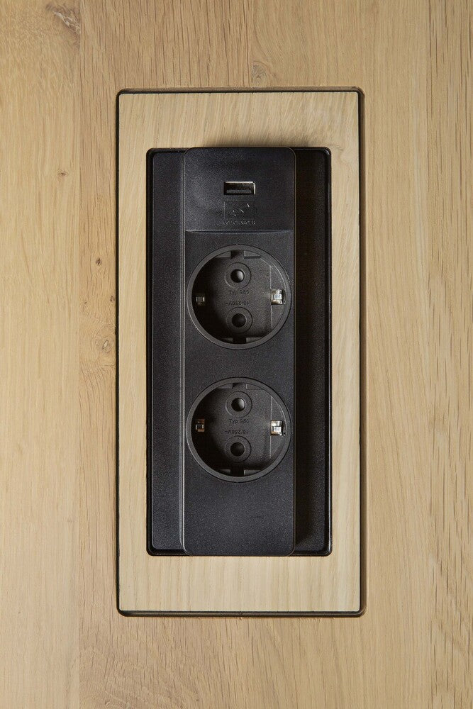 Integrated wire management: 3 sets of flip-open power management, each featuring 2x CEE7/5 electric sockets and 1 USB. TUV certified and compliant with EU directives. Made from slid oak with a varnish finish.